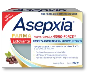 El jabón Asepxia exfoliante tiene como función principal limpiar profundamente la piel, eliminando el exceso de grasa y las impurezas acumuladas durante el día. Gracias a su fórmula enriquecida con microesferas exfoliantes, ayuda a remover las células muertas de la superficie cutánea, promoviendo la renovación celular y dejando la piel más suave y radiante.